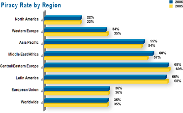 De los 102 países que abarca el estudio de este año, la tasa de piratería cayó en 62 países entre 2005 y 2006 y aumentó en 13. Latinoamérica contribuyó con siete de estos países que experimentaron crecimiento en su tasa de piratería: Chile, Colombia, República Dominicana, El Salvador, Panamá, Venezuela y el mercado identificado como “Otros mercados Latinoamericanos”.
