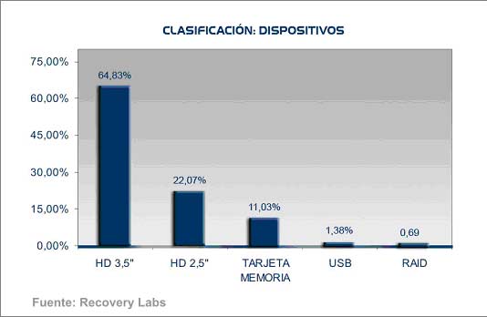 En Alemania, los discos duros son los dispositivos de almacenamiento de datos informáticos más afectados por la pérdida de datos (86,9% de los dispositivos recibidos), aunque Recovery Labs ha observado el creciente incremento de las pérdidas de información en tarjetas de memoria (11,03%).