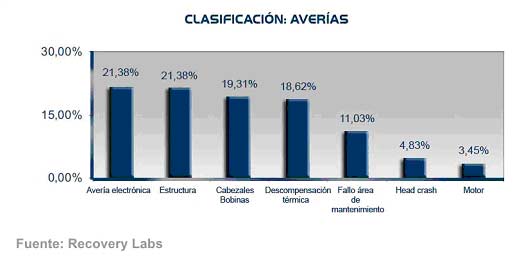 Las averías más frecuentes detectadas en los dispositivos fueron las averías de tipo electrónico y las de estructura, ambas con un 21,38%. Las primeras son averías físicas que suelen ser provocadas por fluctuaciones en el suministro eléctrico, que derivan en cortocircuitos o en algún componente electrónico dañado o quemado. Las de estructura son averías lógicas en las que el dispositivo funciona perfectamente, pero la estructura del sistema de archivos se ha corrompido impidiendo el acceso a los datos. Les siguen las averías en los cabezales y las bobinas (19,31%) y las referentes a la descompensación térmica (18,62%), propias de los cambios bruscos de temperatura.
