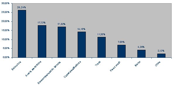 En lo referente a la clasificación de las averías, las de estructura han sido las más comunes (26,24%), seguidas de averías electrónicas (17,73%), descompensaciones térmicas (17,02%) y fallos de cabezales y bobinas (14,18%).