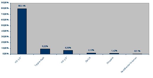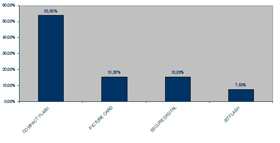 Recovery Labs también ofrece información de la clasificación de memorias tratadas. Así, nos encontramos en primer lugar con las Compact Flash (58,85%), seguido de las Picture Card y Secure Card, empatadas con un 15,38%. El hecho de que Compact Flash ocupe la primera posición en lo referente a recuperación de información no significa que sea el modelo que más falle, ya que tan sólo puede indicar que es una memoria más estandarizada entre los usuarios o los fabricantes de cámaras digitales.